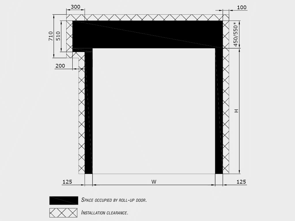 Photocells are installed at 500 mm above the floor level, and at the top of side tracks to detect incorrect unwinding of the curtain