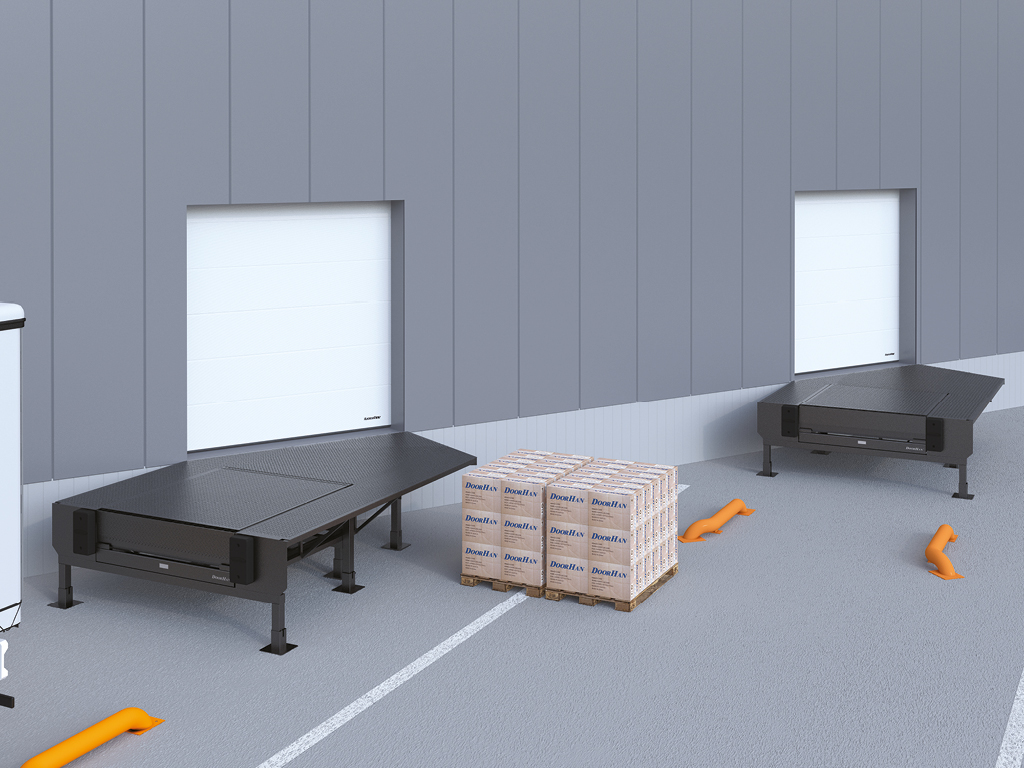 FEH 30 series angled free-standing frame (30°) for a mechanical leveler and an embedded type dock leveler with hinged lip